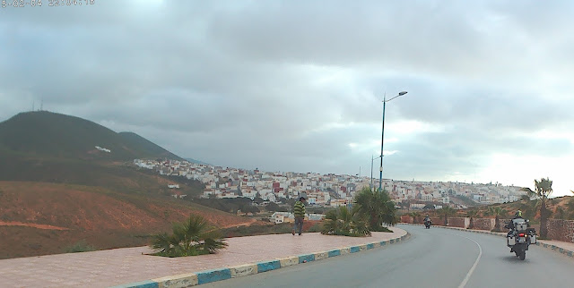 Hotel Oumnia, en Tánger. Salimos algo tarde puesto que estaba lloviznando y la amenaza de temporal era evidente. Al abandonar la ciudad paramos para enfundarnos los chubasqueros.
